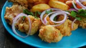 Smażone matiasy z sosem jogurtowym , kuchnia skandynawska